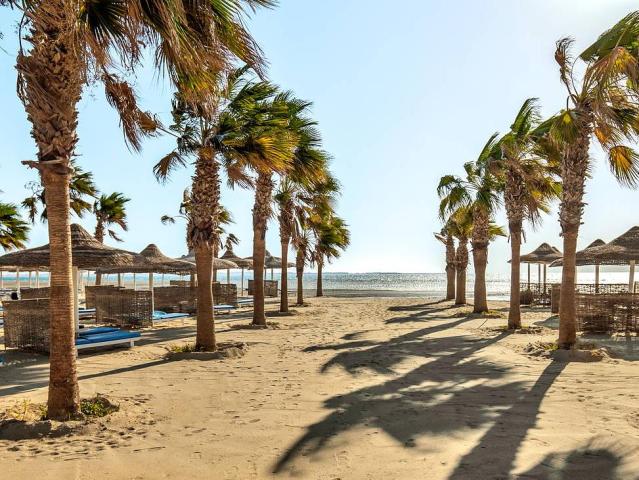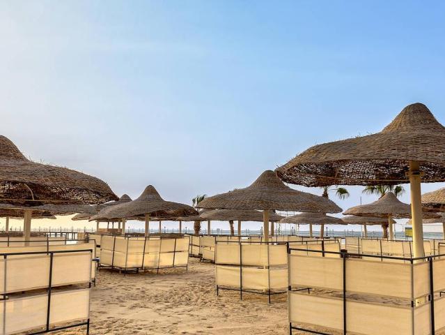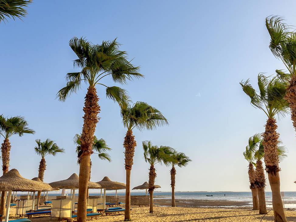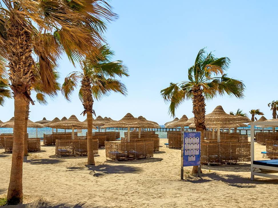 Písečná pláž přímo u hotelu. Lehátka, slunečníky a osušky na pláži i u bazénu - zdarma.